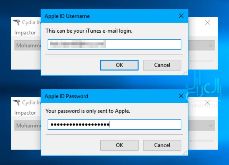 خطوة 1: قم بفتح برنامج Cydia Impactor، ثم اسحب التطبيق (صيغة ipa) وأفلته على البرنامج، سوف يُطلب منك إدخال بيانات حساب Apple ID، قم بذلك.